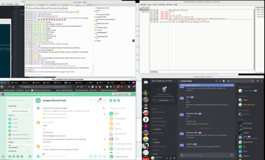 matrix-appservice-discord received a lot of work these past days. Not only the usual small bugfixes, but also some rather big changes: The parsers for both Discord->Matrix sending and Matrix->Discord sending were re-written completely to properly handle things (and thus, at the same time, crunch a bunch of edge-case bugs!). In addition, the long-awaited highlighting issues with @ everyone and @ here (on discord) and @ room (on matrix) were addressed. Some of these things are still in PR stage, but expected to be merged soon!