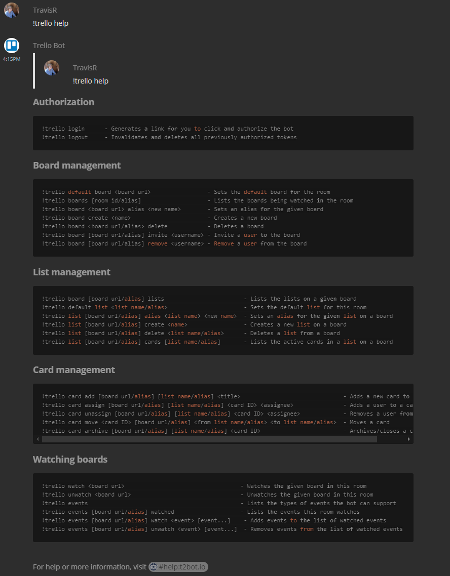 On top of all that, the bot respects that not every room will want to receive every possible notification and offers commands to pick and choose which events it should notify about on a per-board basis. Feel free to give it a spin and check out the massive help menu with !trello help. Please send bugs and suggestions to GitHub :)