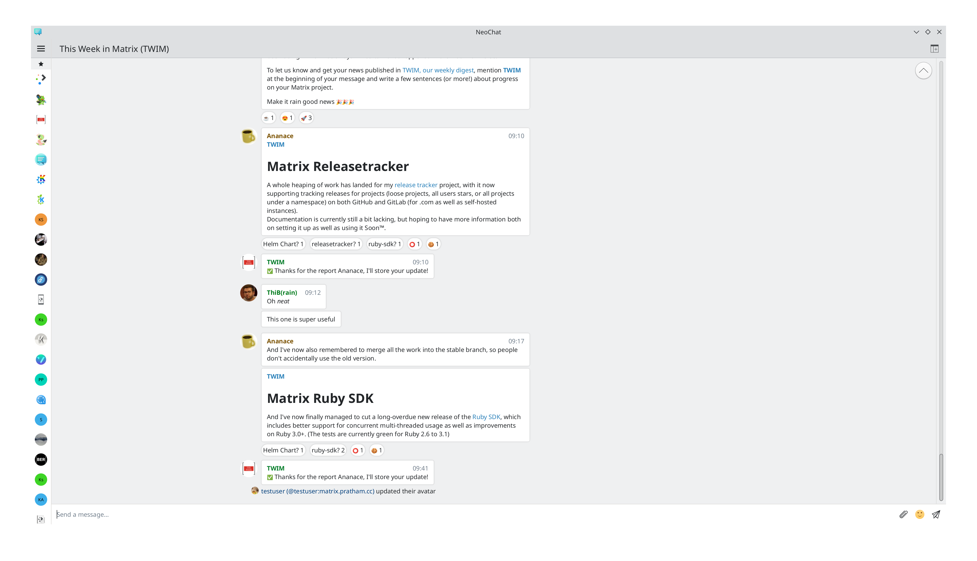 It's been a week of quite, constant progress on many fronts, most not that visible to the outside observer. For once, the progress on integration sliding sync into element-x for iOS has taken up speed, with many smaller bug fixes and additional features exposed through the FFI being added and performance optimisations. After the internal jack-in testing tool, this is the first actual trial of sliding sync for rust (and after the js-implementation, only the second client to actually use sliding sync overall)โand it has been tremendous. Latest tests put the loading time to first view on the first 20-ish rooms at a 150ms range ๐.