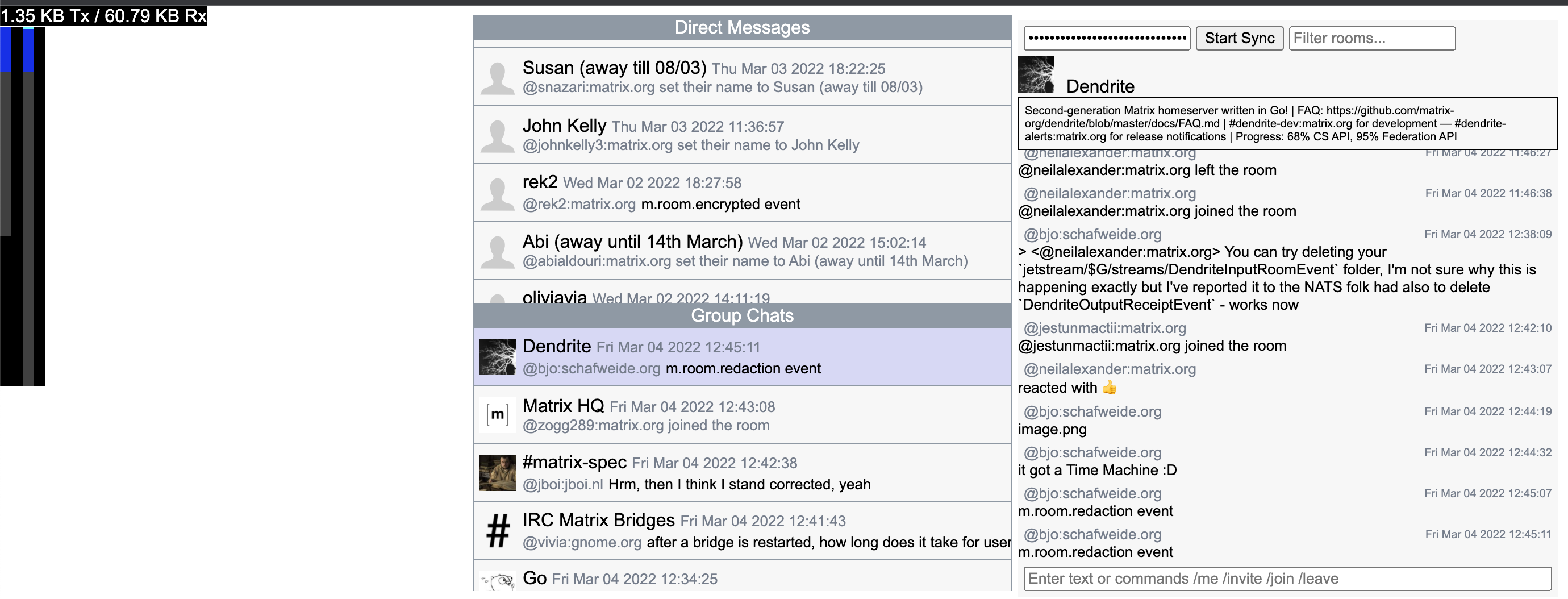 The net result is a basic but incredibly low bandwidth syncing client: 60.79KB to download an entire initial sync on matrix.org. Further improvements will be done on the client to make sure it doesn't scale with the number of rooms on the user's account (it currently does because it naively adds a placeholder for each room in the list) to ensure it remains extremely snappy and a vision for what Sliding Sync can do in practice, right now. Please continue giving feedback on MSC3575 or in