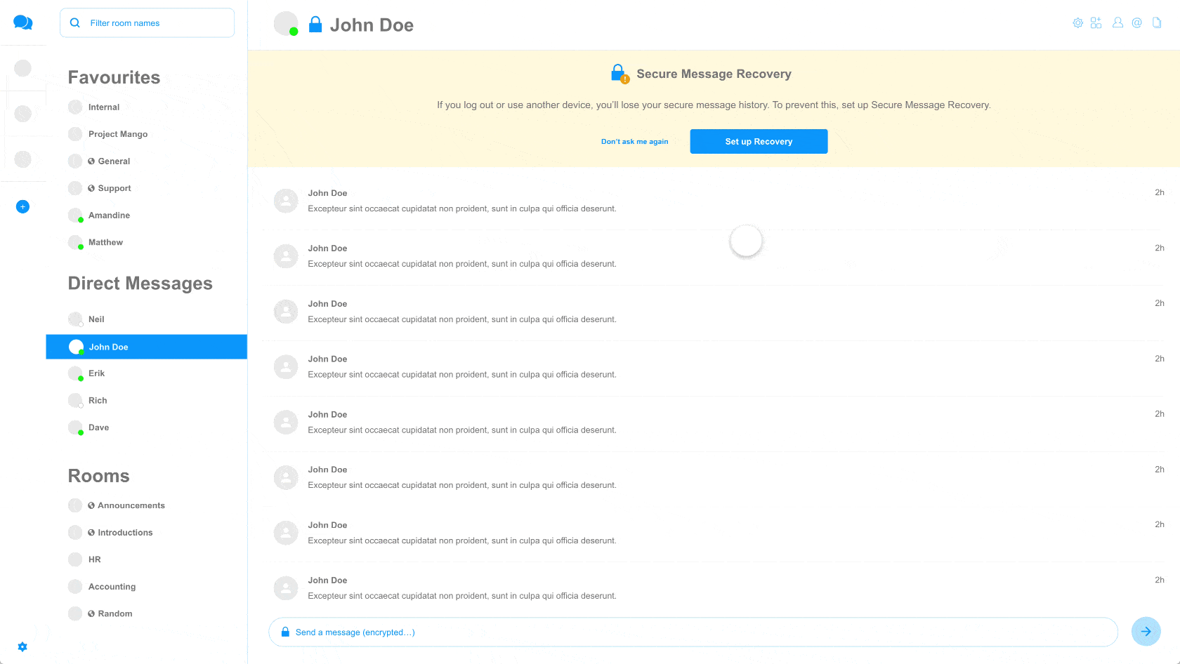 Let's dive in to some of the fundamental concepts we'll be putting forward to deliver a default end-to-end encryption experience that makes sense for most modern users. In this post we'll look at an overview of work-in-progress wireframes, in the spirit of designing in the open and gathering feedback from the wider Matrix community. Please note that these don't represent the actual interface design.