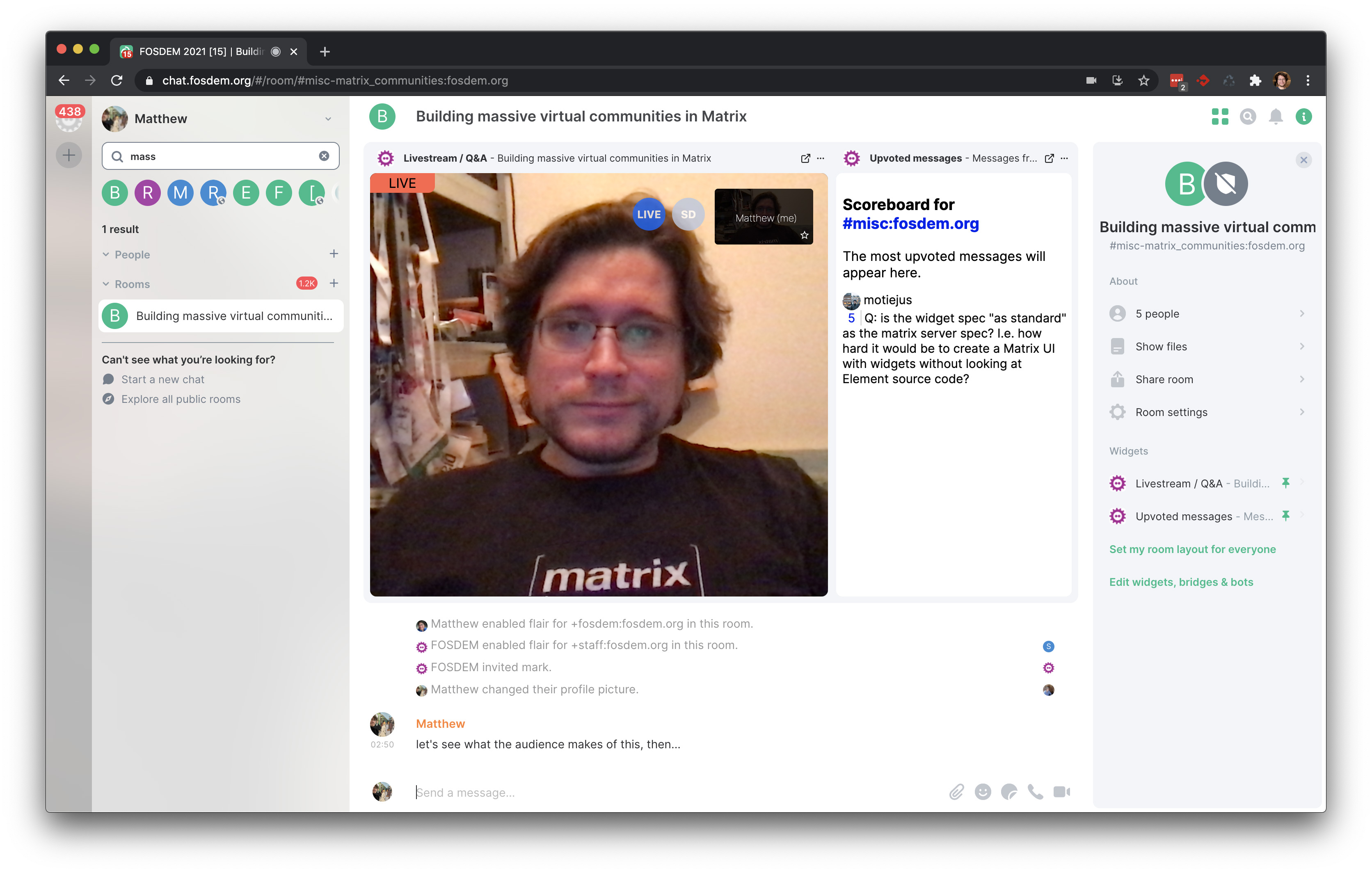 If you want to know more, we also did a talk about FOSDEM-on-Matrix in this month's Open Tech Will Save Us meetup and the Building Massive Virtual Communities on Matrix talk at FOSDEM went into more detail too. Our historical Taking FOSDEM online via Matrix blog has been somewhat overtaken by events but gives further context still.