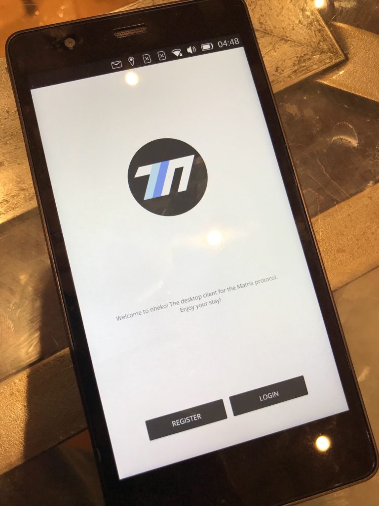 In practice, this has been a fascinating process: setting up a crosscompiler to build all of Qt5.9, and then porting the ubuntumirclient Qt Platform Abstraction to work with Qt5.9, as well as (finally) working out how to build a Qt5.9-compatible custom Maliit input context platform plugin to get the onscreen keyboard (OSK) up and running. But we got there in the end, and it was rather fun to finally see the Nheko splash screen popping up on the Aquaris E5! :D