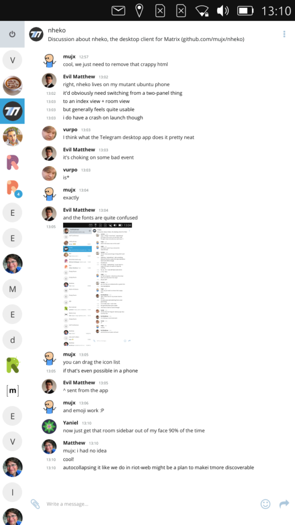 Now the next step here would obviously be to tweak the app properly to layout on a phone (bigger fonts; bigger buttons; resize the window to make room for the OSK; separate the Left Panel from the timeline view; etc) - but the point here was more to show a fully fledged native Matrix client running on a current Linux Phone environment and see how it feels. And we're happy to say that it leaves us dying to get our hands on a proper Librem5 so we can work with Nheko, uMatriks, libqmatrixclient and all the other native Matrix client projects to see how we can get the best possible native client experience running in PureOS for the phone!!