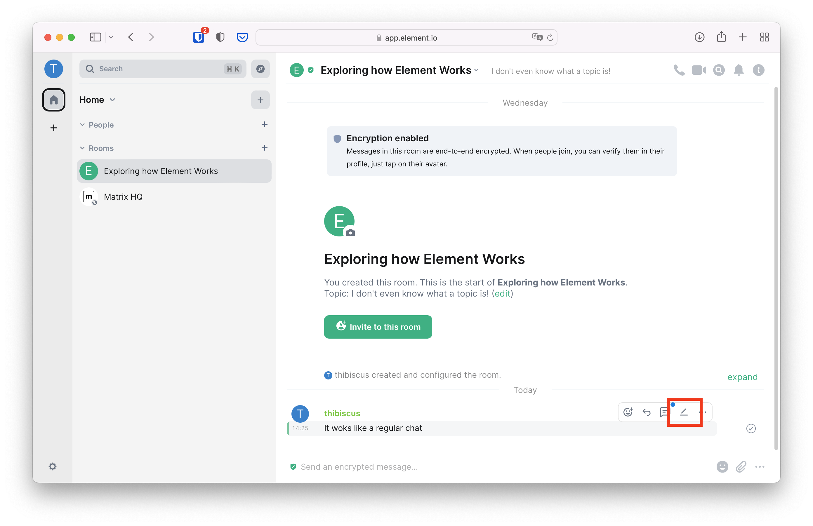 You can see your message in the room! That large area where your message appears (and soon others' as well) is called the timeline. But look more closely: you made a typo! Fortunately, Matrix supports message edits, either by pressing the up arrow of the keyboard or by clicking the pen icon when hovering the mouse over the message we want to edit.