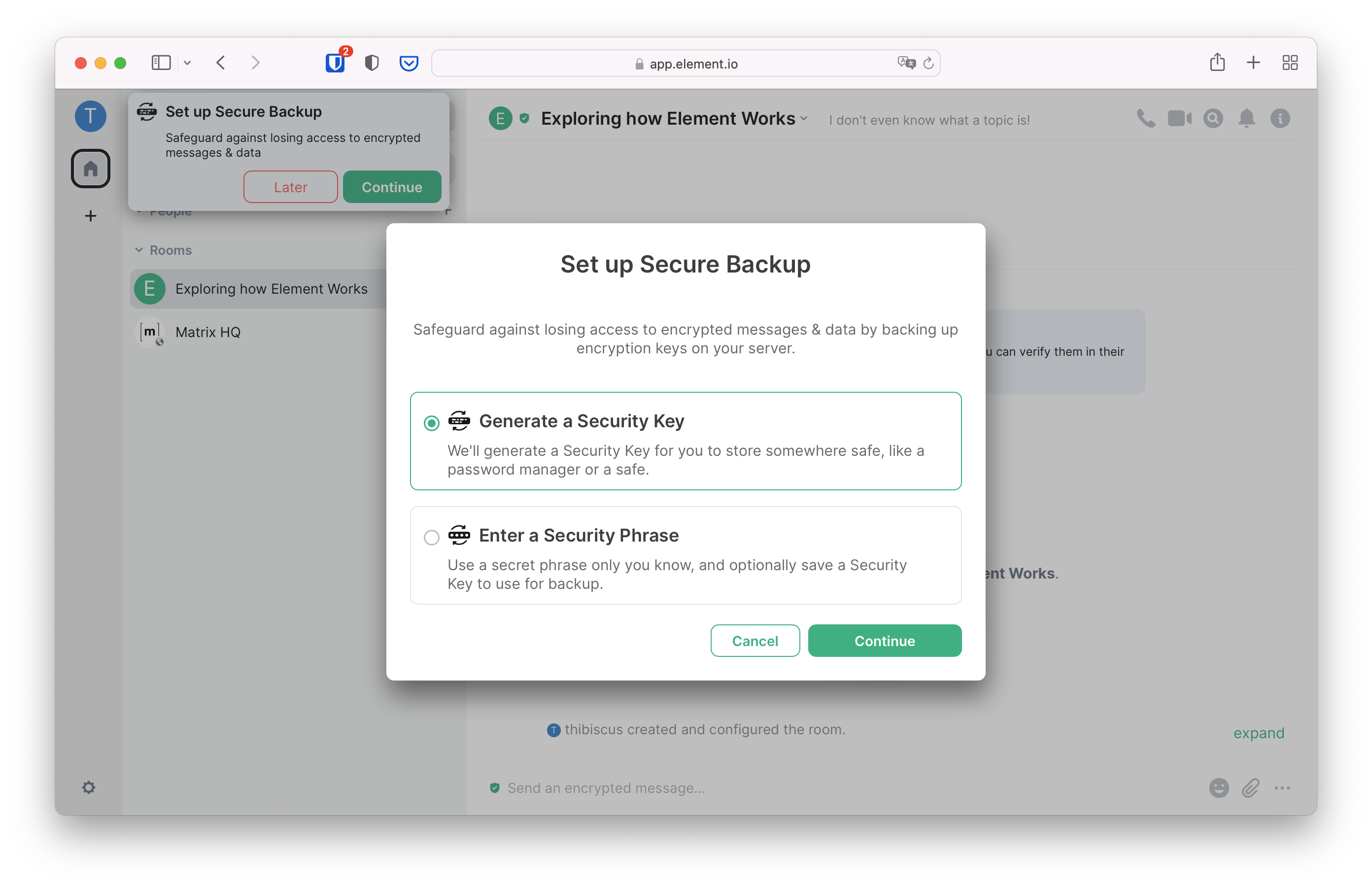 You can either let Element generate a Security Key that is difficult to guess to secure your digital safe, or pick your own. Unless you are an expert and know exactly what you are doing, in most cases it's better to let Element generate it for you. Leave "Generate a Security Key" ticked, and click on "Continue".