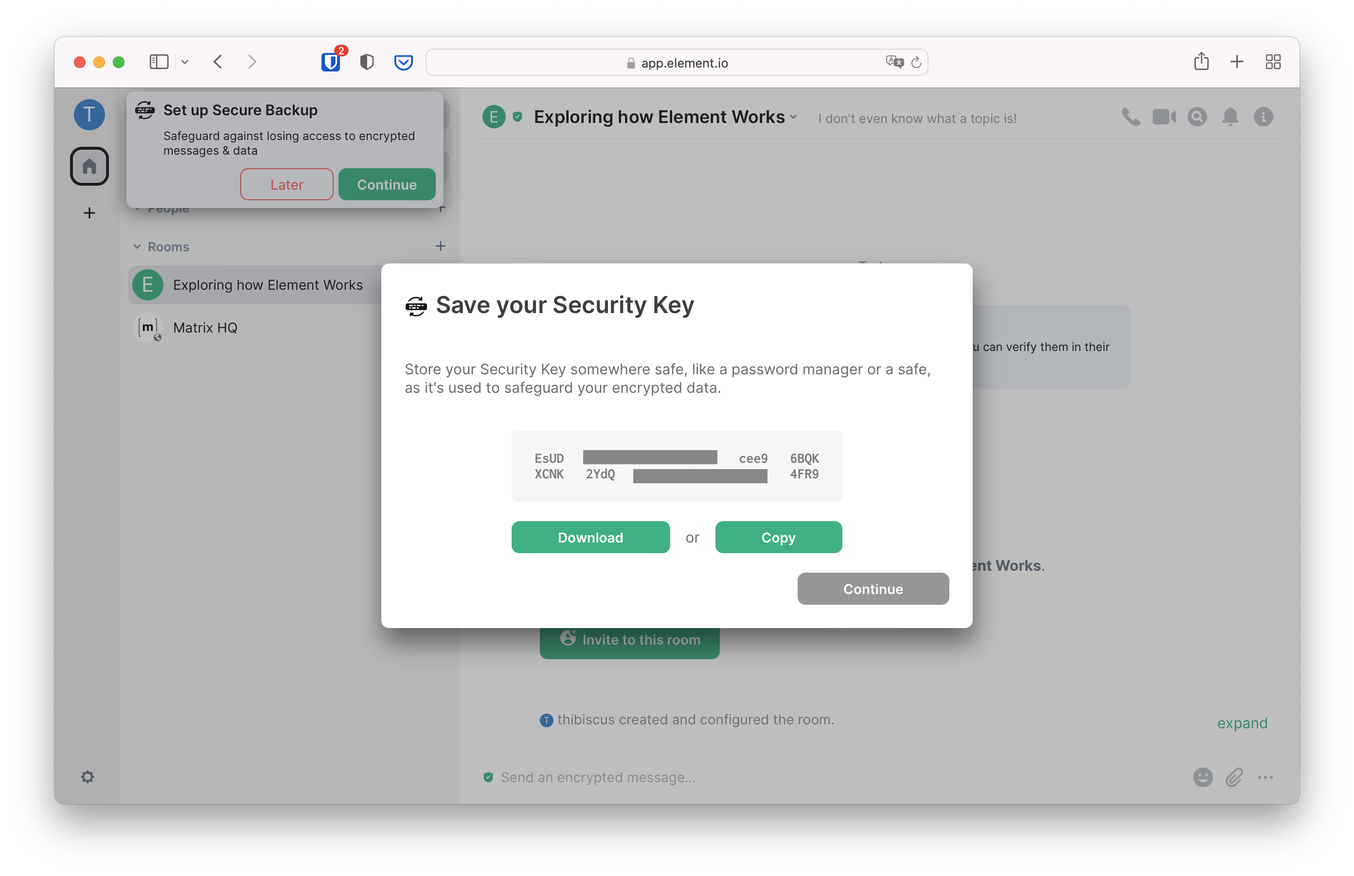 This secret piece of information used to decrypt messages is stored on a digital safe. The key unlocking that digital safe is called a Security Key. Element walks you through the set-up of this digital safe called "Secure Backup" when you click on Continue on the top-left pop-up.